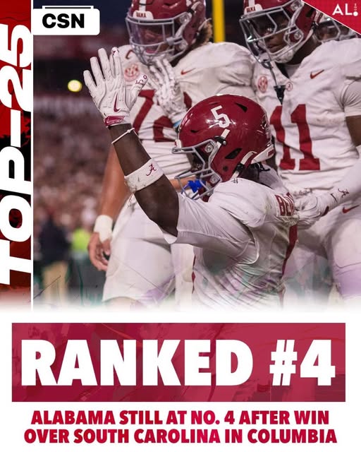 Alabama has once again reminded the college football world why its standard remains among the highest in the sport. Following a commanding and composed performance in a tough road environment, the Crimson Tide surged to No. 4 in the latest AP Poll after an impressive victory over South Carolina. It wasn’t just a win—it was a statement that Nick Saban’s program, even in a new era of parity and unpredictability across college football, still knows how to rise when the lights shine brightest.