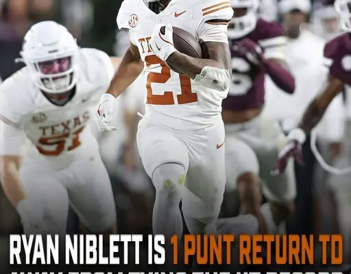 Ryan Niblett has always had the kind of electric speed that can change the outcome of a game in a single play. At Texas, that talent has now translated into something historic. The freshman wide receiver and return specialist is on the brink of etching his name into Longhorn lore, sitting just one punt return touchdown shy of tying the school record of three in a single season. What makes Niblett’s rise so remarkable isn’t just his raw athleticism—it’s his composure, vision, and knack for seizing the moment when the lights are brightest.