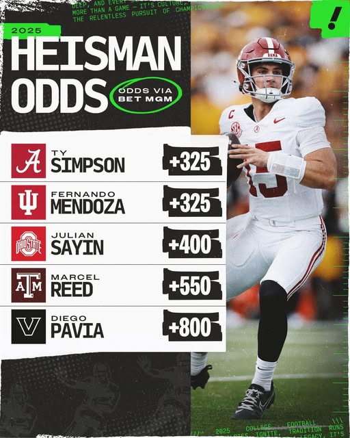 When December arrives and the Heisman ballots are cast, there will be only one name called on that stage in New York City. But regardless of who takes home the trophy, both Ty Simpson and Fernando Mendoza have already won something greater — the respect of the college football world and the hearts of fans who love the game for its unpredictability, its passion, and its ability to produce heroes in unexpected places. The Heisman race is heating up, and as it does, it’s giving us everything we love about college football — drama, brilliance, and the enduring magic of competition at its finest.