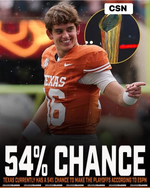 With the first official revealing of the College Football Playoff Selection Show tonight, the Texas Longhorns find themselves in a compelling and precarious position: the numbers currently give them about a 54% chance of making the playoff field. texasfootball.com+3Sportskeeda+3ESPN.com+3