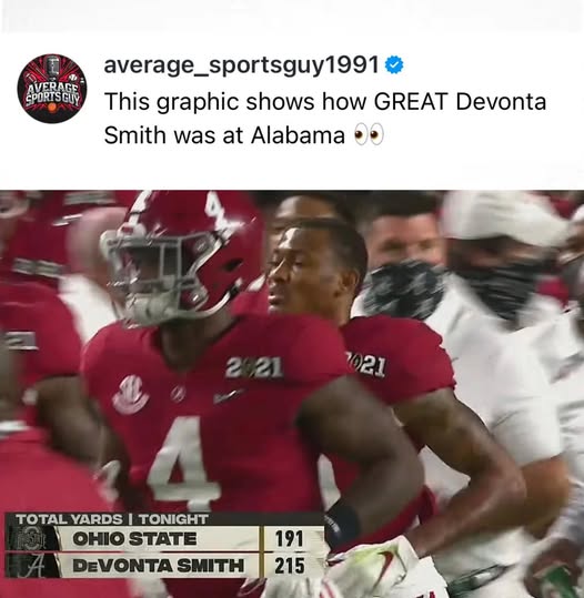 For Alabama faithful, that game remains a memory etched in gold. It was more than a win—it was a moment of artistic dominance that transcended sport. Smith’s 215-yard half wasn’t just about yards or touchdowns; it was about mastery. It was about a player understanding the game on such a deep level that he could manipulate every defender, every coverage, every angle to his advantage. His chemistry with Mac Jones was telepathic, the product of countless hours on the practice field perfecting timing and trust. Every motion, every glance, every release told a story of preparation meeting destiny.