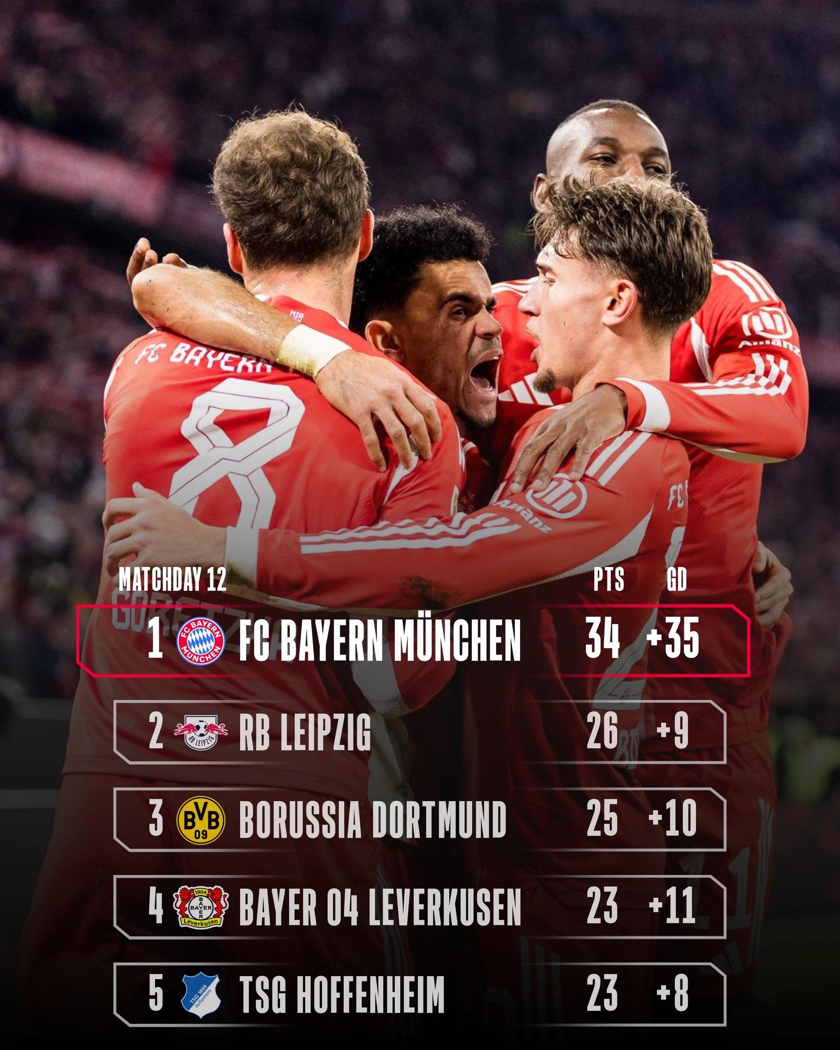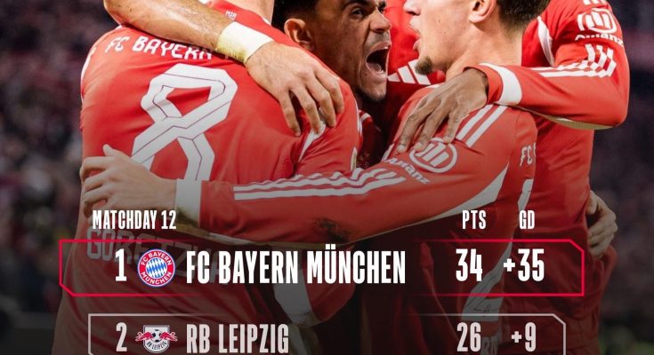 „FC Bayern München dominiert die Bundesliga: 34 Punkte und +35 Torverhältnis nach Spieltag 12 – Kann sie überhaupt jemand herausfordern?“